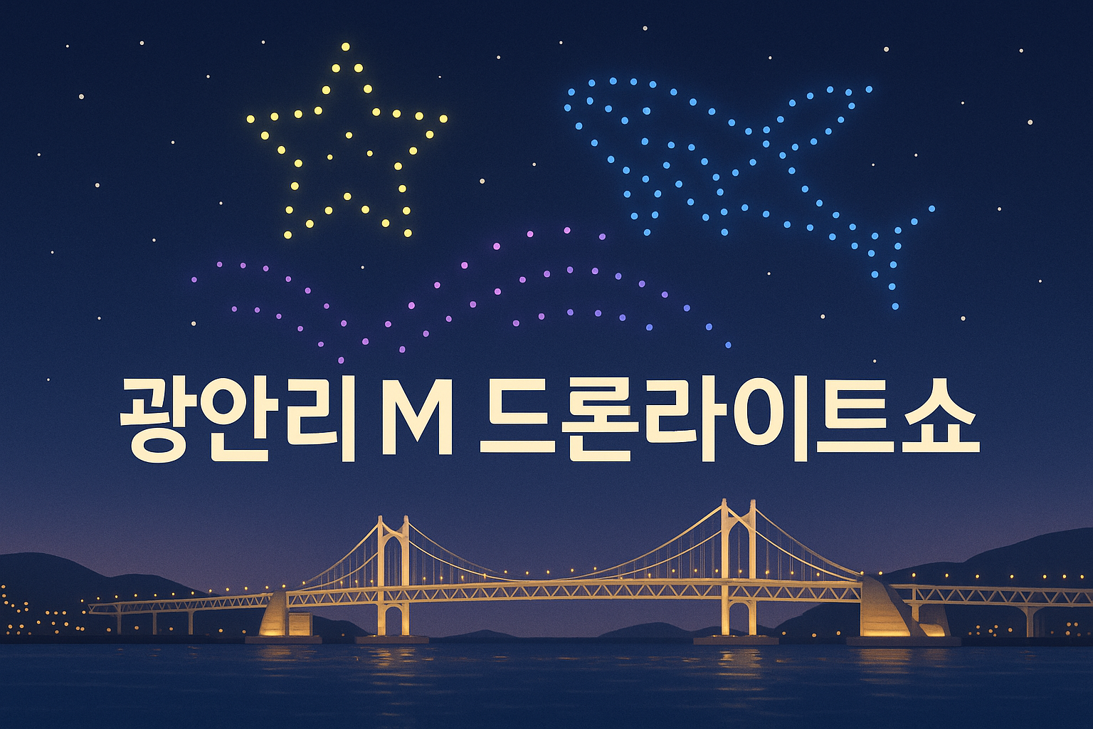 밤하늘 위로 형형색색의 드론이 춤추듯 움직이며 만들어내는 이미지들은 단순한 불빛이 아니라 도시의 감성과 바다의 잔향이 담긴 하나의 예술 작품처럼 다가옵니다. 광안대교 야경과 드론들이 만들어내는 그래픽의 조화는 사진으로 담아도 좋고 영상으로 기록해도 좋으며 사운드와 함께 느끼면 더욱 생생한 몰입감을 선사합니다.