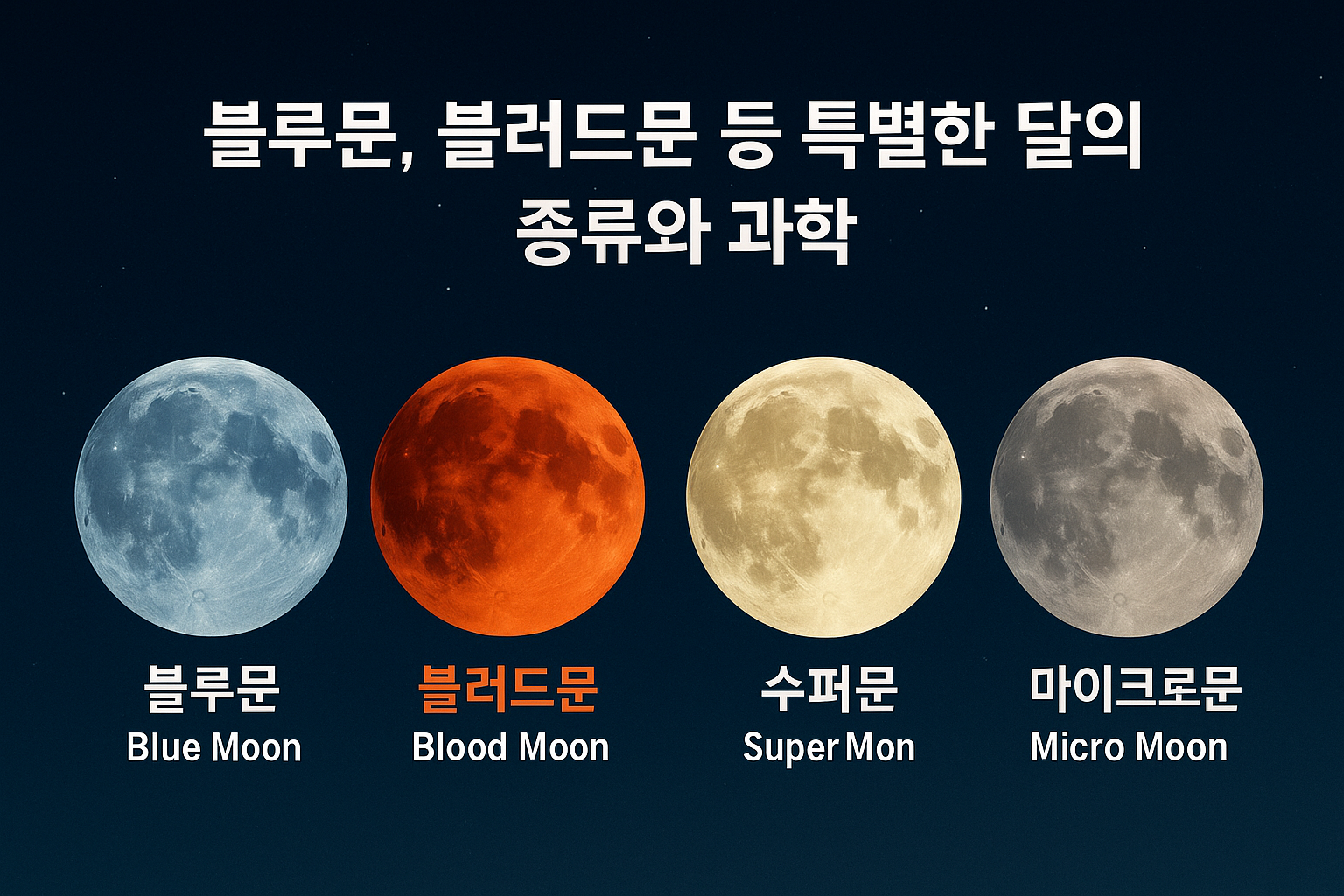 밤하늘을 수놓는 보름달. 하지만 우리가 흔히 보는 달 말고도, 때때로 특별한 이름이 붙은 ‘특별한 달’ 현상이 관측되곤 합니다. 블루문, 블러드문, 슈퍼문, 마이크로문 등등… 도대체 이 달들은 무엇이며, 과학적으로 어떤 의미를 갖고 있을까요? 오늘은 천문학과 문화가 만나는 달의 특별한 현상들에 대해 깊이 있게 파헤쳐봅니다.